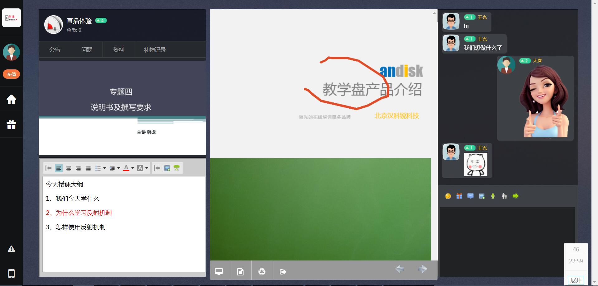 可以直播桌面,摄像头,同时可以打开文件进行讲解,所有点画操作会同步直播给用户....